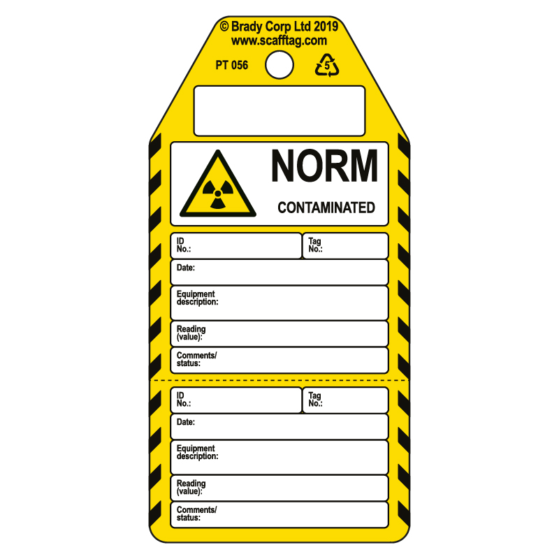 'Norm Contaminated' tags are designed to identify equipment or areas that has been inspected and found to be NORM contaminated. These tags are single sided and have a punched hole to allow a cable tie to be passed through and secured to the valve. A blank area at the top of the tag allows for company logos or other relevant information. Manufactured from 0.5 polypropylene the tag is extremely tear resistant, UV stablised and 100% recyclable