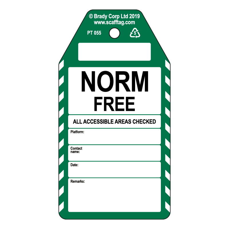 'Norm free' tags are designed to identify equipment or areas that have been identified as NORM free. These tags are single sided and have a punched hole to facilitate a cable. A blank area at the top of the tag allows for company logos or other relevant information. Manufactured from 0.5 polypropylene the tag is extremely tear resistant, UV stablised and 100% recyclable