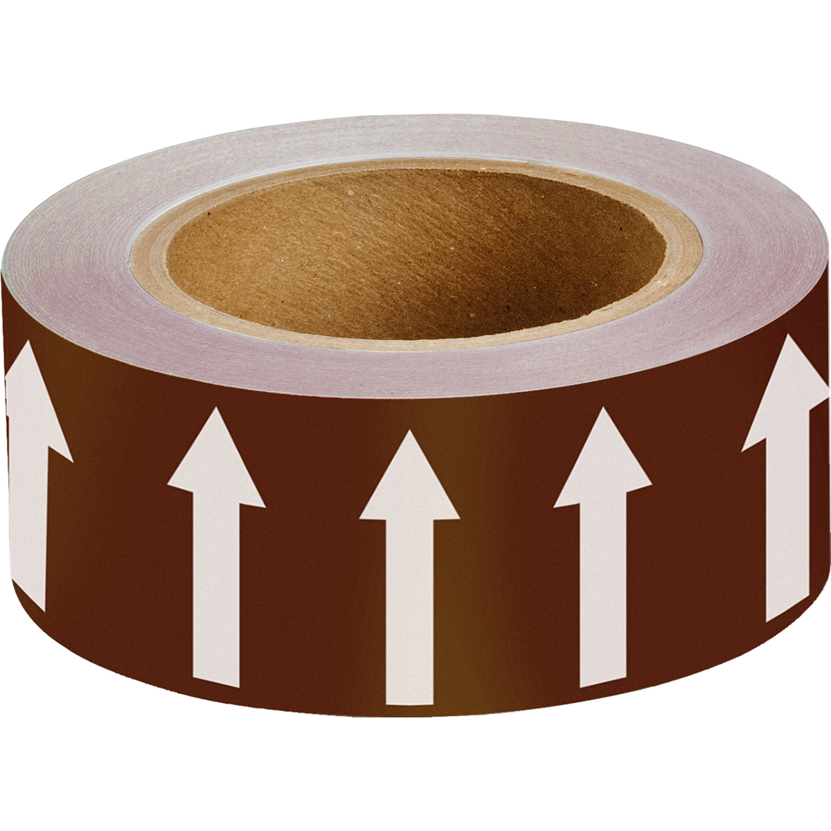 33mtr rolls of solid colour self adhesive tape with directional arrows - white on brown