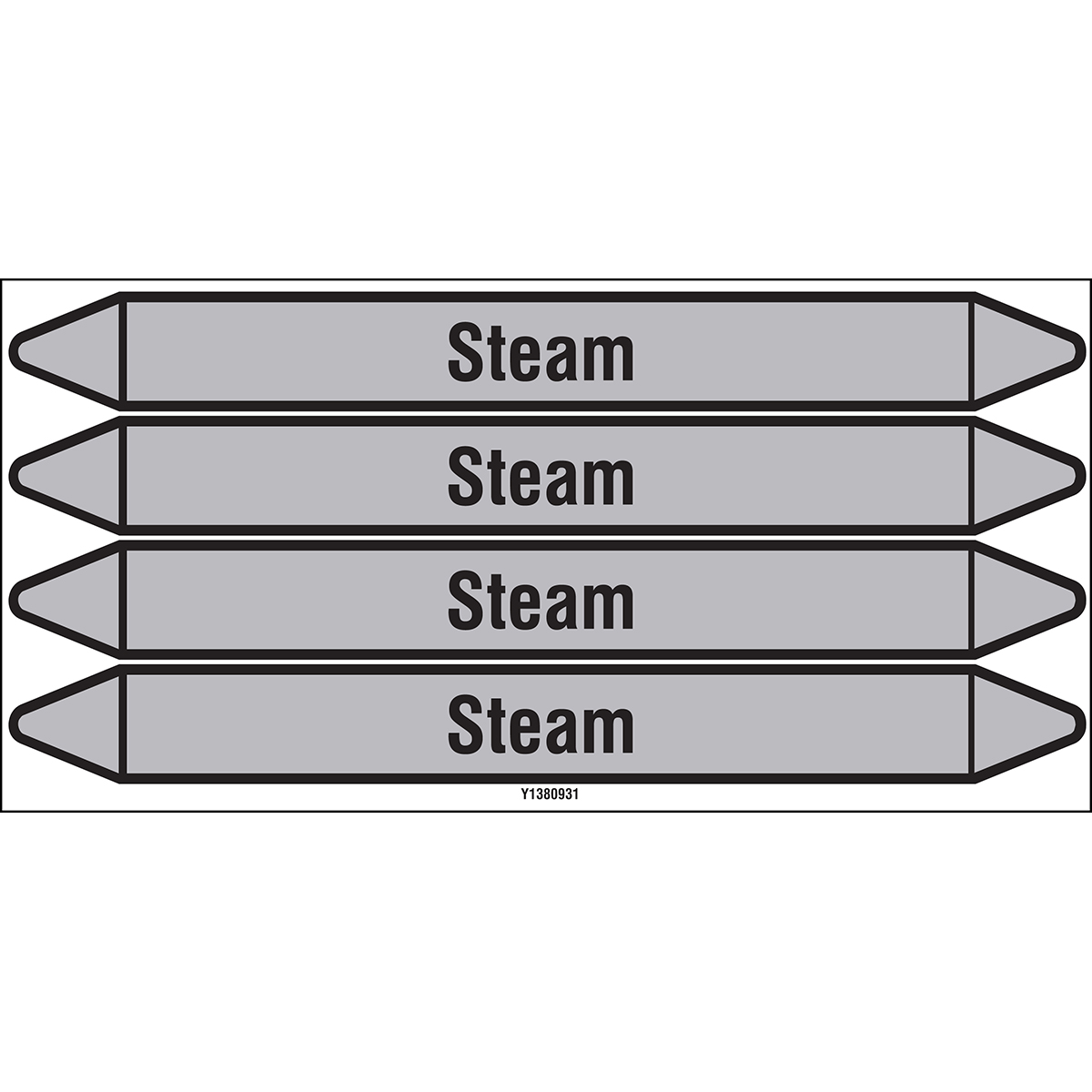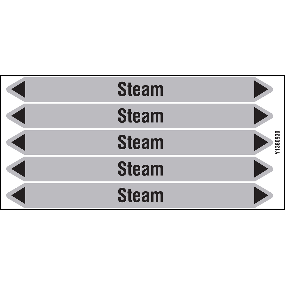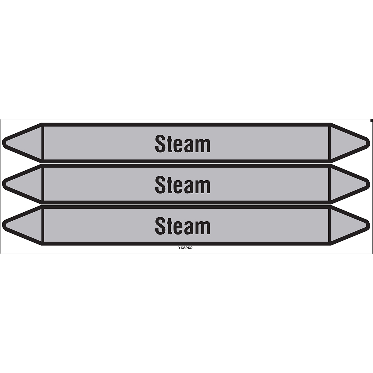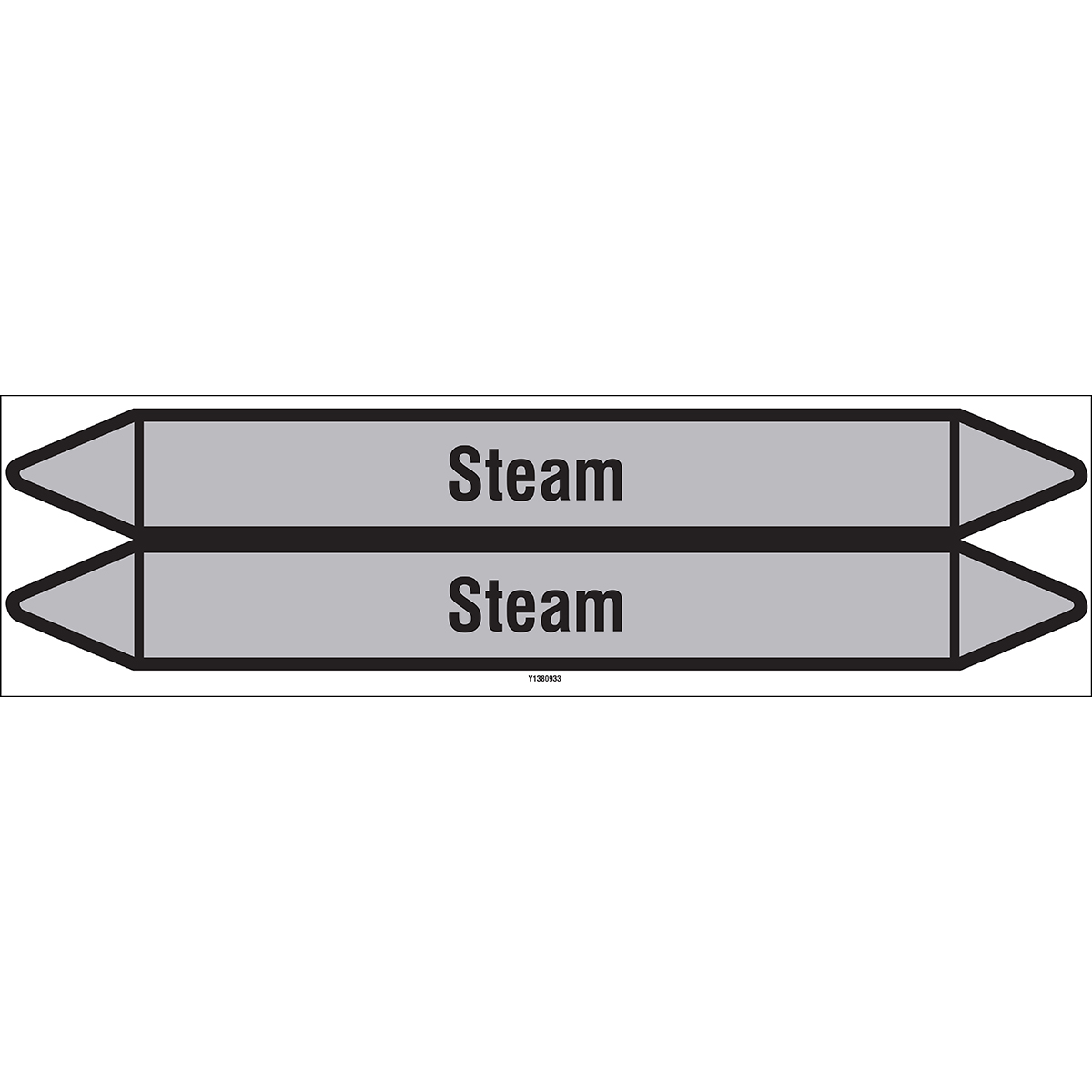 European style self adhesive individual pipe markers on peel off backing card for pipes containing Steam - no pictograms - Various widths available. Please select desired card size and product from drop-downs below. Direction arrows can be easily removed to suit flow direction.